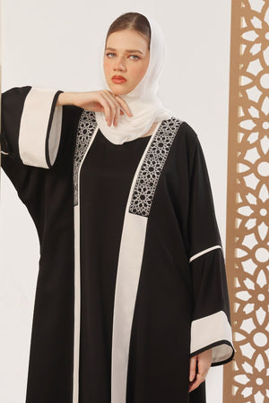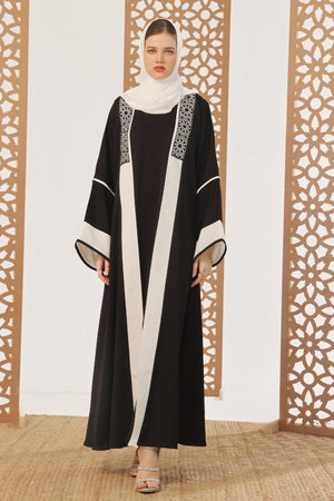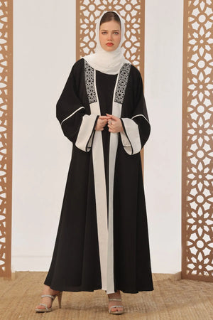 - Design Detail: The open-front shrug abaya features black embroidery inspired by the architecture of mosque wall design and is executed using the line art. It has a front open with a Square neckline Black inner piece included.