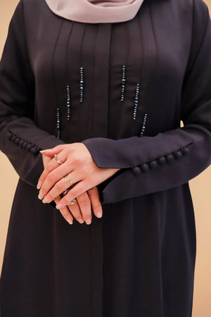 The meticulous, handcrafted beaded design on the front and pleats on the back, complemented by manipulation buttons on the sleeves, draws inspiration from a fairytale look, executed in a similar color. This wedding abaya offers a perfect blend of comfort and luxury.