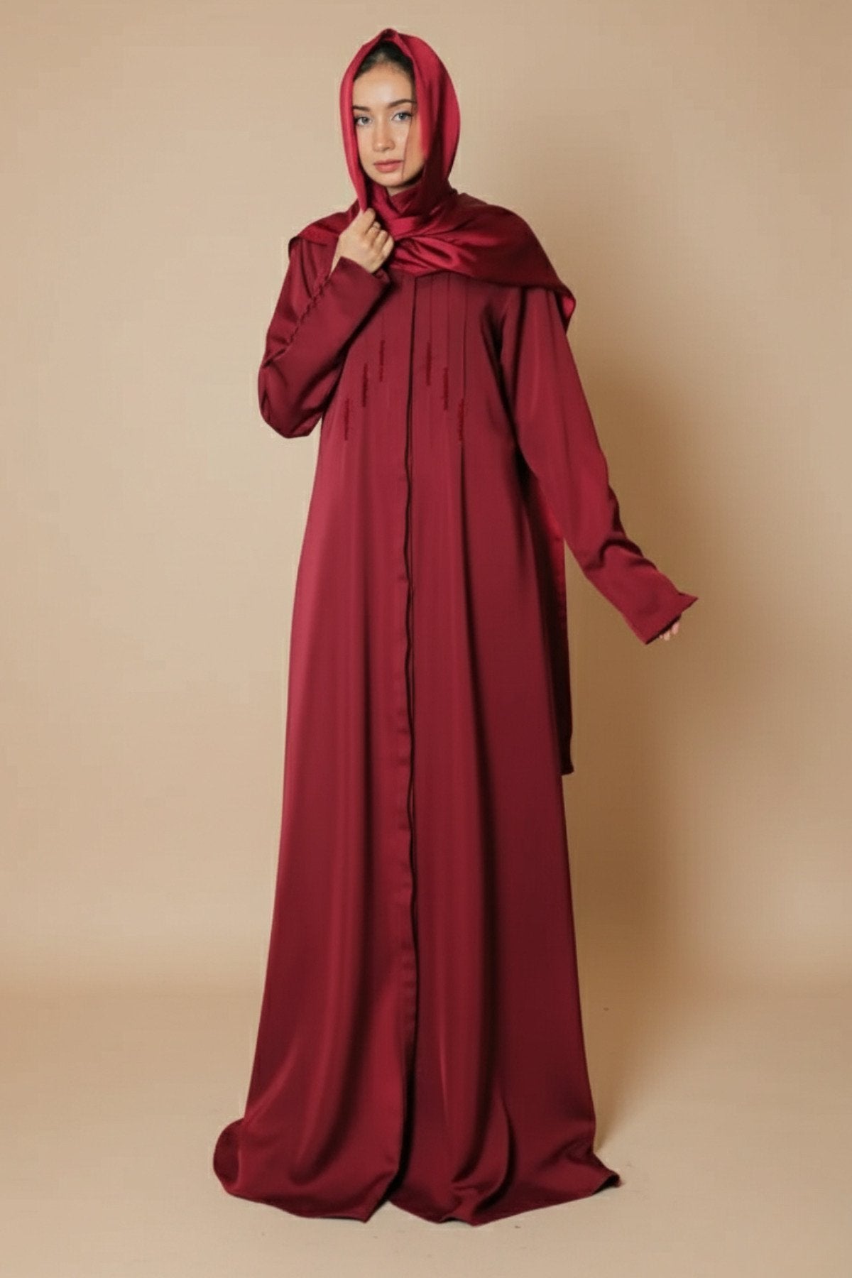 - Design Detail: This wedding Abaya features a Flat ban collar with handcrafted beaded on the front and pleats on the back with manipulation buttons, slit open straight sleeves, and draws inspiration from a fairytale look