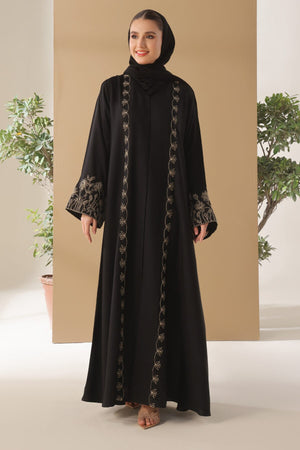 The meticulous Gold floral cord embroidery on the front and sleeves draws inspiration from lotus and oak plants, and is executed using the Line art technique with gold color. This wedding abaya offers a perfect blend of comfort and luxury.